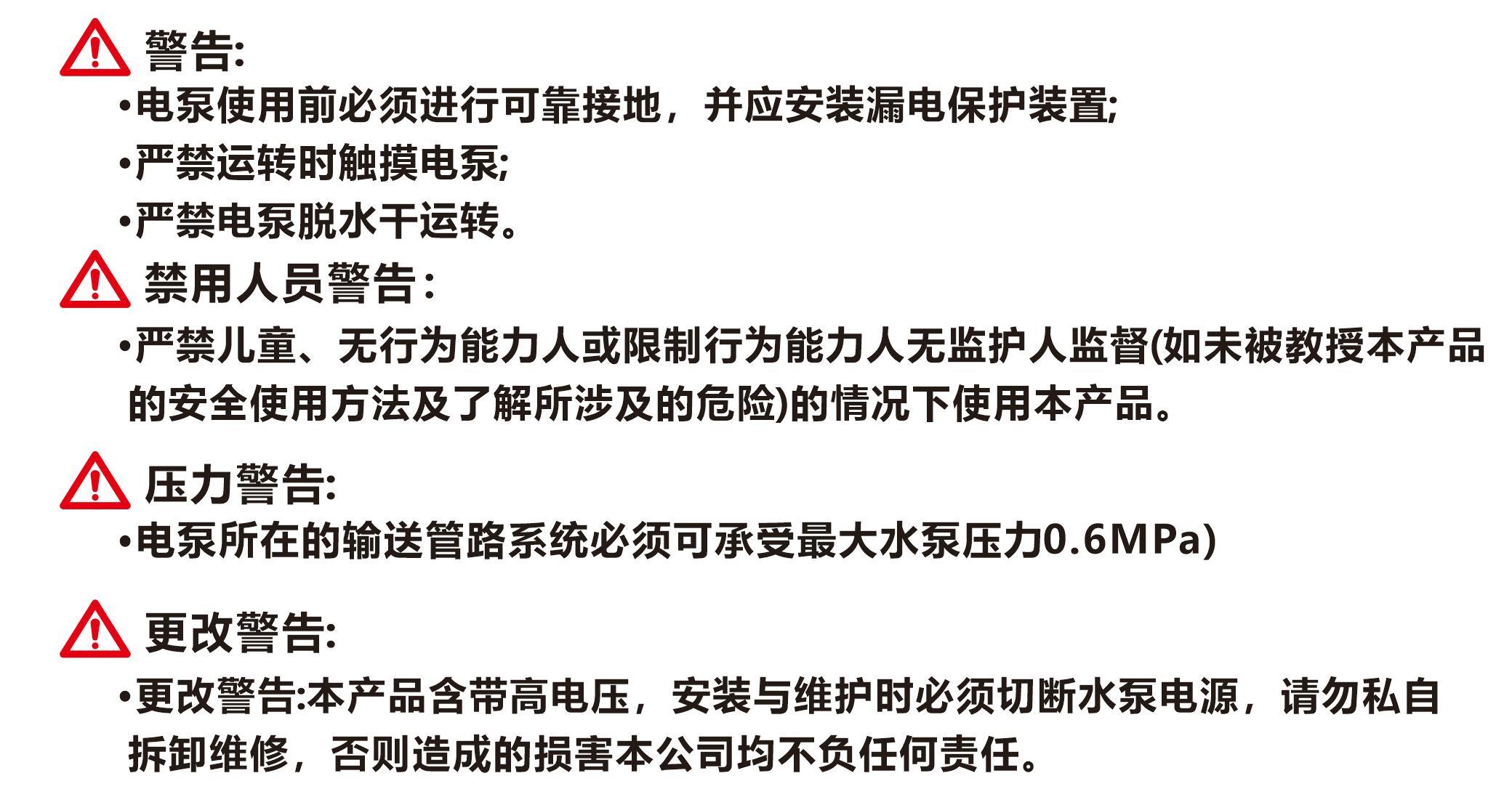 1、本产品内置变频器,不可作为潜水泵使用,禁止放置于水中,以免坏。